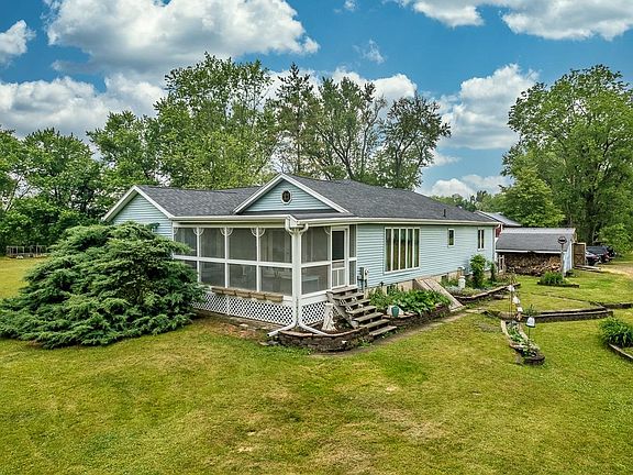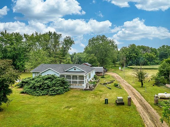 Where the Eagles Fly! Partially updated open floor plan 2,200 sq ft MOL, low maintenance ranch on 23 acres MOL with outbuildings located in a flood plain. .7 of a mile off of US 20. Wonderful scenic, secluded property with frontage on Pecatonica River. Yellow creek nearby. Nature lovers delight or sports enthusiasts paradise. Complete with your own island as Pecatonica River wraps around it. Lovely meadows, woods with mature trees and 15 acres MOL State Forestry Plan until 7/2029. Great house! Loads of big windows to allow light to stream in or observe the beauty of nature, deer, wild turkey, otters, and numerous species of birds. Sharp great room with walls of windows, 12+' beamed cathedral ceiling open to inviting 3-season, and kitchen with island, tons of cabinets opens to the family room with wood burner. 3 spacious bedrooms. Designated bedroom with French doors to 3-season and roughed in master bath, walk-in closet. Oversized main bath with jacuzzi tub. Main floor laundry. Hobbyists will be delighted with 20x11.8 workshop. 20x18 barn. Seeing is Believing!