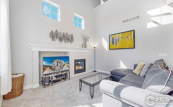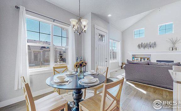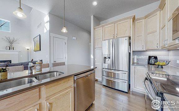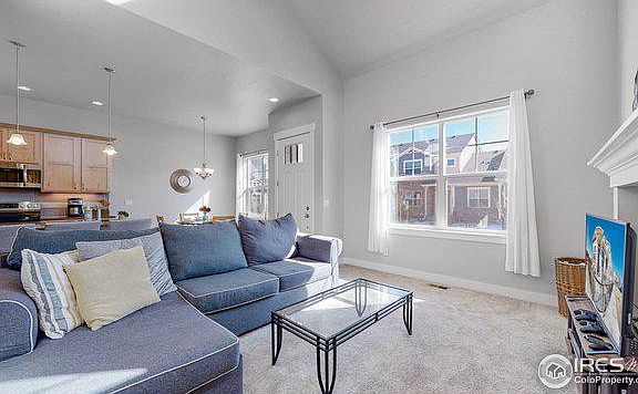 Popular Addison floor plan - ready now! This light and airy townhome has a main floor master with a 5-piece master bath with a tub. Soaring 2-story living room with clerestory windows and a gas fireplace. This lovely home has a patio and small, fenced yard facing a park area. The garage has an extra space for a work bench or bikes. The loft area upstairs could be used for an office or extra living room. Kitchen with natural maple cabinets, quartz countertops, and SS appliances. No metro tax! Located right on the Loveland trail system. High-end finishes include engineered wood floors, tile bathroom floors and shower surrounds, tile backsplashes, brushed nickel hardware, and undercabinet lighting in the kitchen. End unit. Cable TV and High-Speed Internet included in HOA fees.