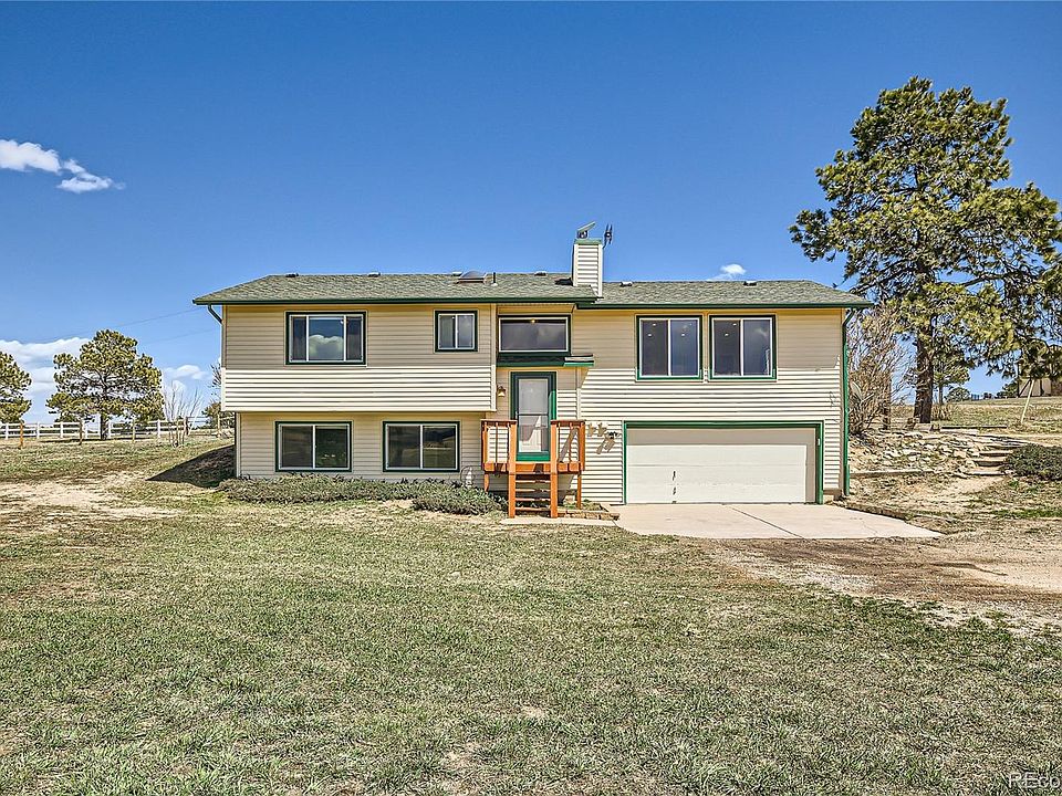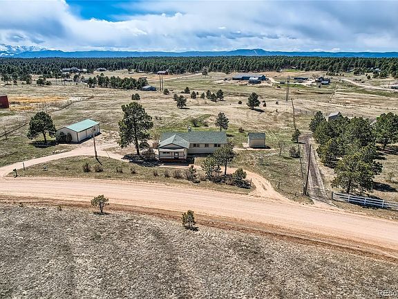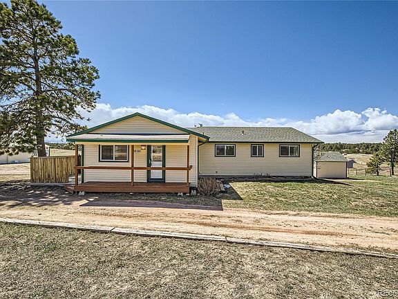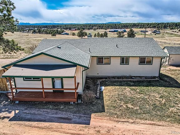 Welcome to country living at its finest! Nestled on over 5 acres of picturesque landscape, this charming home boasts breathtaking mountain views including stunning vistas of Pikes Peak. Experience the tranquility of rural life while still being just minutes away from schools and town amenities. Step inside to discover an updated interior, featuring four bedrooms and three bathrooms with a two car attached garage and detached shop with another garage space. Bathed in natural light, the dining area off the kitchen provides a warm and inviting space for casual dining, while the adjacent living room w/ fireplace offers the perfect setting for relaxation and gatherings. The kitchen is a chef's delight, showcasing stainless steel appliances, stone countertops, and plentiful hickory cabinets for storage. Two main floor bedrooms share an updated full bath. The convenient office space is perfect for remote work. Retreat to the primary bedroom, complete with a private 3/4 bath for added comfort and privacy. The finished basement provides additional living space, including a cozy family room, a bedroom, a 3/4 bath, laundry facilities, and ample storage. Access to the two-car garage ensures convenience and functionality. Outside, a workshop with an extra garage spot and a shed offer plenty of space for storage and hobbies. Enjoy outdoor living at its best with a side patio and back deck, perfect for relaxing and soaking in the scenic surroundings. This property has been lovingly maintained, with the septic system completely redone in 2020 for peace of mind. Don't miss this opportunity to own your slice of paradise in the Colorado countryside. Schedule your showing today and experience the beauty and tranquility of rural living!