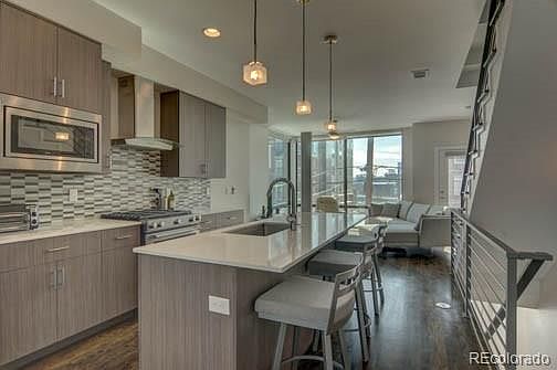 Sleek and modern CORNER UNIT with views of Downtown and the Mountains in the distance atop the sundrenched Rooftop Deck! Timeless Brick and Metal Brownstone Style Townhome in a central LOHI location. Walk to several restaurants, Rockies games, Pepsi Center, and more. Off-street parking in your over-sized 1 and 1/2 car garage. Lower level flex space would make an ideal home/office or additional sleeping area with 1/2 bath. Main level living room/kitchen with custom Floor to Ceiling glass windows and balcony off the front with a deck off the kitchen that is plumbed for your gas grill. Top of the line Kitchen Aid pro SS appliances and quartz counters. Upper level master bedroom and ensuite guest bedroom with built-in murphy bed. Rooftop deck is plumbed for yet another gas grill and has plenty of space for entertaining and is ready for your hottub. The opportunity for nightly rentals make this a smart investment. NO HOA, there is an exterior maintenance agreement and Party Wall.
