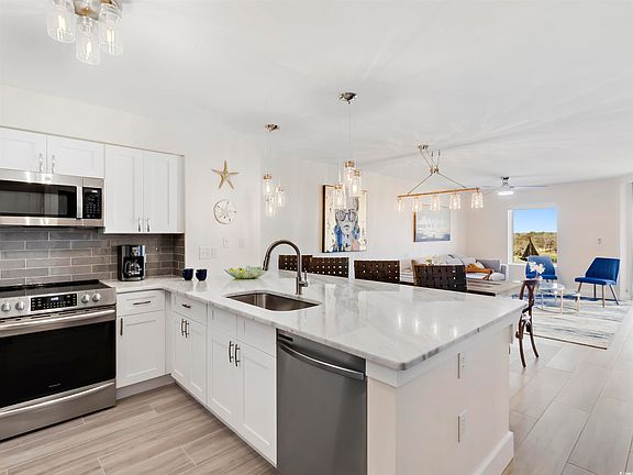 Indulge in this move-in ready 3BR luxury vacation condo fully renovated located just a 2 minute walk from Cherry Grove beach. Step into an impeccable chef's kitchen with brand new shaker style cabinets, new stainless steel appliances, W/D, wood-like wide plank tile floors and oversized granite breakfast island/bar perfect for entertaining, with additional beverage station and undercounter storage cabinets on the dining side, custom lighting through-out the home, tastefully furnished, bright and spacious, each bedroom has it’s own en-suite bath equipped with speakers, new vanities and designer tile, 3 locked owners closets. Relax at the primary bathroom spa-like stand up shower and seamless glass door and step into the sunset balcony with tranquil pond and golf course views. Immerse yourself in resort style amenities: outdoor/indoor pool and hot tub, lazy river, kids water play area and sauna. Tilghman Beach & Golf Resort is conveniently located a across the street from the beach. With proximity to top attractions, shops, dining and entertainment, this condo is perfect for those seeking a vacation getaway or investment property. Don’t miss your chance to experience the best of coastal living!