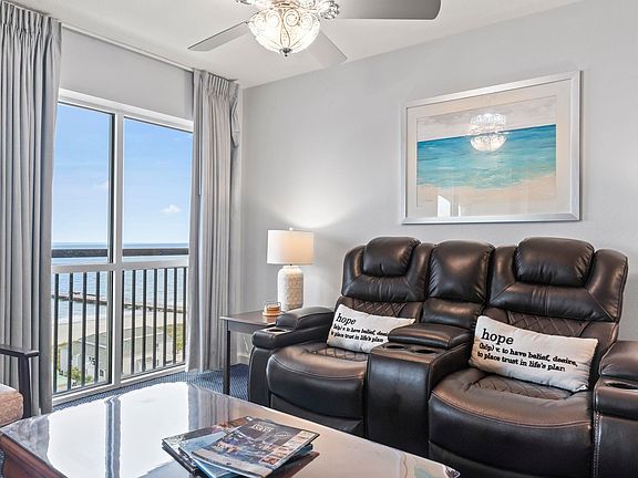 Experience luxurious coastal living in this top-floor condo at the prestigious Tilghman Beach and Golf Resort in North Myrtle Beach. Enjoy breathtaking ocean and beach views from the extra-wide balcony! This condo has been meticulously updated with a contemporary neutral color scheme, solid surface countertops, a high-end faucet in the kitchen, and modern light fixtures. The master bedroom features a spacious walk-in shower and a newer, energy-efficient HVAC system ensures year-round comfort. This is like new condition. The resort offers an array of amenities that cater to families and guests alike, including an indoor heated pool and hot tub, a dry sauna, an outdoor pool with a sunning patio, a lazy river, a children's water-play area and wading pool, an indoor cardio room, and an onsite bar and grill. Located close to Main Street's shops, local restaurants, and frequent festivals, as well as Ocean Drive, the heart of shag dancing culture. Best of all, Cherry Grove Beach is just steps away, easily accessible via a pedestrian signaled crosswalk right in front of the resort.