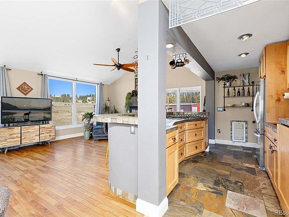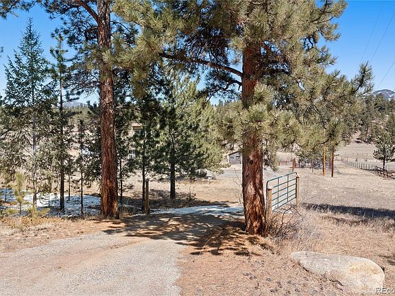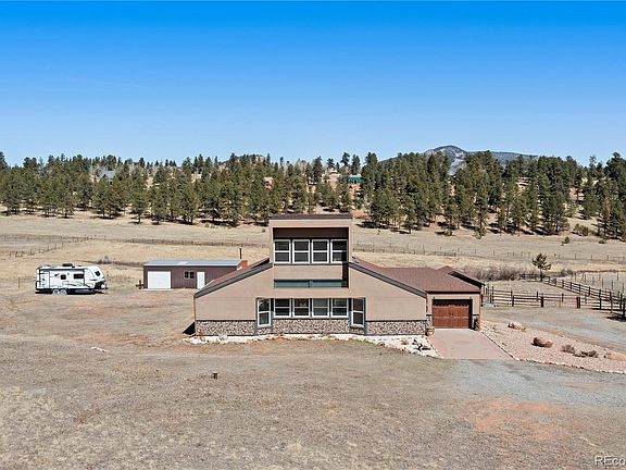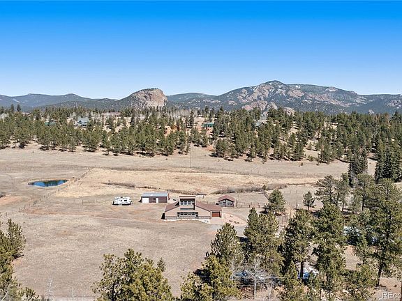 Welcome to your own private sanctuary—an almost 5-acre horse property nestled in the breathtaking foothills just outside of Denver. With sweeping views of Mount Rosalind and direct access to miles of hiking and horseback riding trails, this one-of-a-kind home offers a perfect blend of adventure and tranquility. Step outside your door and into a landscape teeming with wildlife, where golden aspens shimmer in the fall and the scent of pine fills the crisp mountain air. Whether it's a peaceful morning walk or an invigorating ride along the private neighborhood trails, every moment here feels deeply connected to nature. The home itself is a stunning retreat, filled with natural light from oversized, sun-filled windows that frame the incredible mountain views. An open floor plan with vaulted ceilings and hardwood floors creates a warm and welcoming atmosphere. A cozy two-sided fireplace adds charm and comfort to both the living room and the backyard deck. The kitchen brings a rustic mountain vibe, featuring rich wood cabinetry with glass fronts, a gas cooktop, and unique tile countertops. The main level includes a bedroom with a truly one-of-a-kind en-suite bathroom, showcasing exposed copper pipes and matching ceiling tiles. Upstairs, a loft-style bedroom offers expansive views that will leave you in awe. This property has been thoughtfully updated with a new gas furnace, well pump, pressuer tank, front and storm doors, garage door and opener, gutters, ceiling fans, light fixtures, windows, carpet, stucco, paint, and an updated second bath. Just 20 minutes from C-470, this serene escape is close enough to enjoy all the amenities of Denver, yet far enough to feel like another world entirely. This is Colorado living at its finest—wild, beautiful, and truly unforgettable.