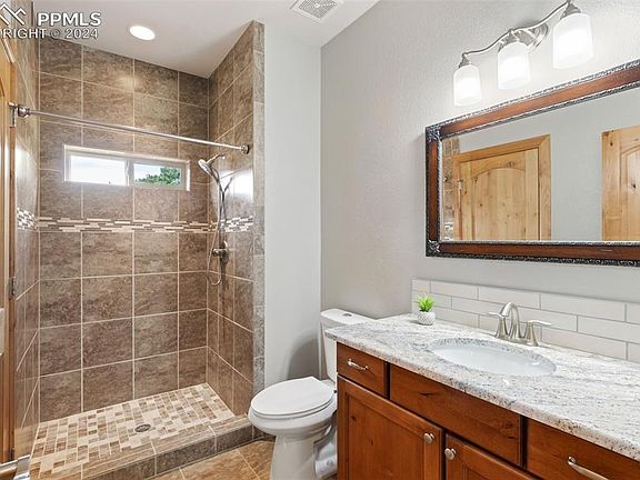 Welcome to this beautifully maintained ranch-style home, perfectly positioned on a corner lot within a quiet cul-de-sac in the sought-after Briargate community. This property offers an exceptional blend of comfort, luxury, and convenience. As you arrive, you'll be impressed by the attractive stucco exterior, enhanced by stone accents and low-maintenance landscaping. Freshly painted in 2023, the home exudes curb appeal. Located next to a city-owned and maintained retention pond, you’ll enjoy added privacy and peace of mind without the need for flood insurance. Plus, the serene Rampart Park Trails are just moments away for your outdoor enjoyment. Inside, the main level features gorgeous hardwood floors, with alder wood doors and cabinets adding a touch of elegance throughout. The living room boasts vaulted ceilings and a cozy gas fireplace, creating a welcoming and spacious atmosphere with tons of natural light. The renovated kitchen, completed in 2023, is a chef's dream, featuring new granite countertops and a top-of-the-line cooktop. Fresh interior paint from 2022 adds a bright and modern feel to the space. The home is designed for convenience, with a main-level laundry room and luxurious heated floors in the primary bathroom. The fully finished basement is an entertainer’s paradise, complete with a spacious wet bar and ample room for gatherings. The basement's high ceilings and carpeted floors ensure it remains cozy and inviting. Step outside to take in stunning mountain views, surrounded by mature trees including a plum tree, blue spruce, and maple. The HOA-maintained sprinkler system ensures your landscaping stays lush and vibrant. With quick access to Chapel Hills Mall, I-25, Whole Foods, top-rated D20 schools, restaurants, shopping, and parks, this home is ideally located for convenient living. Don’t miss your chance to own this exceptional rancher with breathtaking mountain views—schedule a showing today!