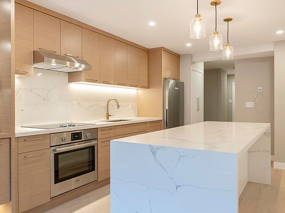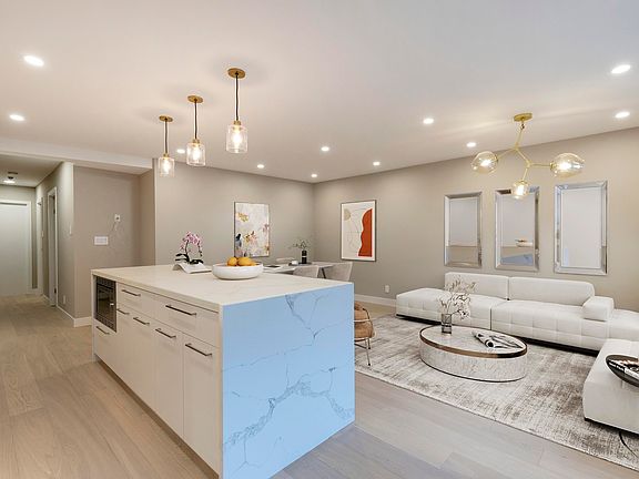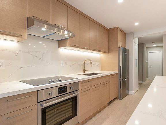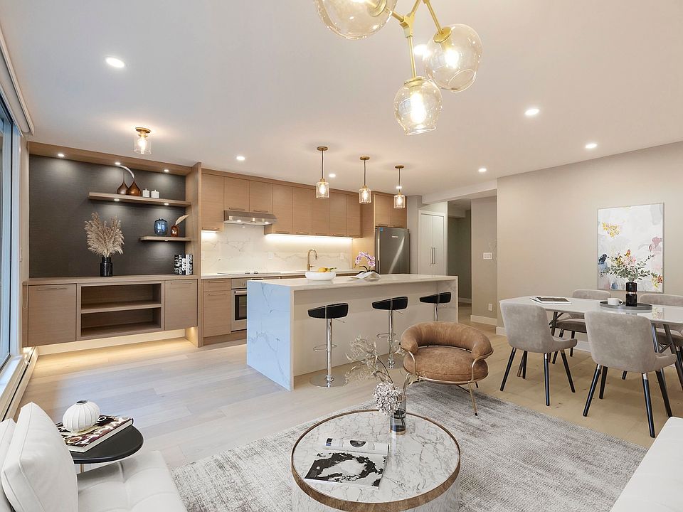 Beautifully transformed 'West of Denman' home with large private terrace! This lovely corner suite features engineered hardwood throughout, smoothed ceilings with all new lighting, and a great layout with a large open living area. The spacious kitchen integrates full height custom cabinetry, media wall, large island with waterfall sides, and quartz countertops and backsplash. Both bedrooms face the quiet west side of the building. This home includes new in-suite laundry and an office nook. 'Pendrell Place' is a rain-screened concrete building that's been re-piped, new elevator, exterior paint, and updated lobby and hallways. This home is located just steps to the English Bay Beach, Stanley Park, and Denman shops and restaurants. 1 parking stall is included. Pets and rentals are welcome!