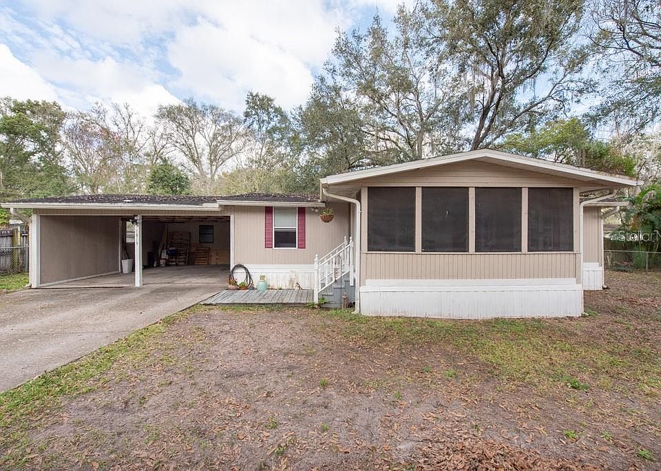 Step into comfort and convenience with this charming manufactured home in the heart of Lakeland, Florida. Boasting 3 bedrooms and 2 bathrooms, this residence offers a cozy retreat with a generous 960 sqft of living space on a sprawling .28-acre lot. Privacy is paramount with a fully fenced-in yard, providing a secure haven for both relaxation and play. The property features a convenient shed, perfect for additional storage, and 2 car ports to protect your vehicles from the Florida sun. Inside, revel in the modern touches that elevate this home. The flexible storage room provides versatility, while the new laminate flooring throughout exudes contemporary style. The kitchen is a culinary delight with stainless steel appliances, ensuring both functionality and aesthetic appeal. Stay comfortable year-round with the benefit of a newer AC system. Embrace the Florida lifestyle on the screened-in front porch, creating an ideal spot for morning coffee or evening gatherings. For nature enthusiasts, a short walk takes you to Gator Creek Park, offering outdoor activities and scenic beauty. This location also provides easy access to I-4, making trips to Orlando or Tampa a breeze, each within a 30-45 minute drive. Convenience is key, as the property is situated just off 98, providing a quiet oasis while maintaining proximity to shopping and the vibrant restaurant scene in Lakeland. Experience the best of Florida living in this well-appointed manufactured home. Roof is from 2015.