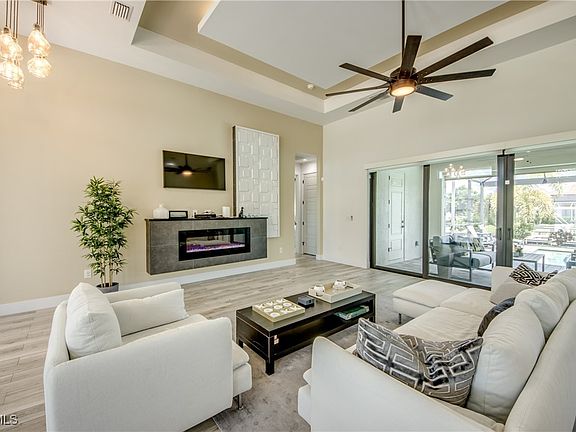If you have been looking for a newer construction Single Family Home with an elegant European flair and a distinctive sophisticated style, this is the ONE you have been waiting for! A luxurious blend of thoughtfully designed spaces, upgraded interior features, open floor plan concept and the ultimate outdoor space complete your Florida lifestyle! The heart of the home is the great room that offers impressive 12 ft. trey ceilings with accent lighting, 9 ft. sliding glass doors to the lanai, wood look plank tile flooring and an electric wall-mounted fireplace. Gather in the kitchen with the massive island with breakfast bar, waterfall quartz countertops, slate finished Stainless Steel Appliances and the modern, high gloss, European style cabinetry. The Owner's suite feels like a retreat with an extra large bedroom providing access to the lanai area, dual walk-in closet and the most spectacular bathroom around. The space includes a zero edge (curbless) walk in shower with multiple shower heads, deep soaking tub, double sinks, private toilet closet and linen closet. Don't overlook the outdoor space that includes an outdoor kitchen with wine cooler, oversized heated pool, outdoor shower and space to entertain. For your piece of mind, the yard has a black chain linked fence for you furry friends, electric hurricane roll down shutter for the lanai and whole house impact windows and sliders. Plus a dock with lift that is a perfect location to park your boat. Come see what sets this house apart from all of the rest!