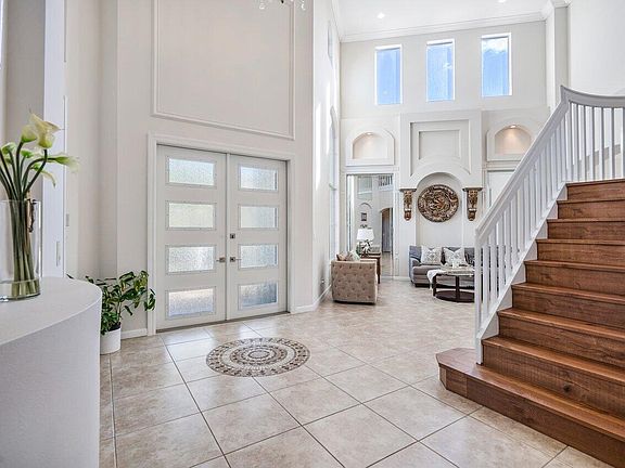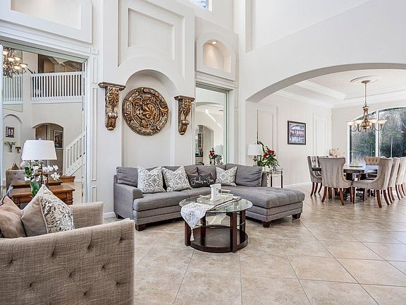 This ELEGANT home offers more than 4200 sq ft. of living space (4 bedrooms, plus office AND sitting room). The large yard backs to the beautiful Madison Green golf course and has ample space for a private pool. Lovely, gated front walkway leads to elegant double doors (hurricane impact) and a two-story foyer. Bright, formal rooms with crown molding accents, tray ceilings and volume ceilings. Very spacious kitchen with granite countertops, chef's island, abundant cabinet space and stainless-steel appliances, including a double wall oven. A generous eat-in area is surrounded by bay windows and looks out onto the patio and yard. Crown molding, French doors to the patio and a private bar are highlights of the open family room. The half circle granite bar is adorned with backsplash, liquor shelves, drawers and cabinet storage. Additionally, there is a 1st floor office that is large enough to be a bedroom with access to a full downstairs bathroom. The upstairs primary suite is oversized and elaborate, with tray ceiling, crown molding, wood blinds, rolling blackout shade and sliding glass doors to a back balcony. There is a significant sitting room that could be set up as an office or fitness area. His & Hers walk-in closets & double vanities, Roman tub, walk-in shower and a linen closet. The 2nd floor offers 3 secondary bedrooms and two full secondary bathrooms, both with tub/shower combinations.