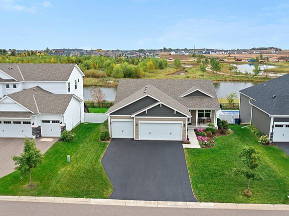 This like new one-level living rambler with 3 bedrooms, 3 bathrooms and a 3 stall garage is situated on one of the most desirable lots in coveted Avonlea! Entering the home, you're invited to an open-concept living room, dining room and kitchen, all leading to sweeping views over the deck, pond and backyard. This home was built for those who love sunrises!!! The kitchen features slate appliances and plenty of cabinet and countertop space. Main level laundry, the primary suite, and second bedroom and private full bathroom complete the main level. The basement leads to ample open space for entertaining as well as a sliding glass door accessing the backyard patio which offers plenty of space for gatherings and barbecues. The lower level offers another bedroom, bathroom and two storage rooms. Mechanicals include an upgraded dual zone HVAC system! Just a stone's throw from restaurants, grocery and downtown Lakeville along with easy access to I-35, Cedar Ave.
