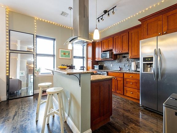 Rare find! Spacious 2 bedroom / 2 bath condo with extra office nook and recently rebuilt private roof deck pergola with the potential to be further expanded for a direct view of Manhattan! Top floor unit with high ceilings and flooded with natural light provides an airy living space to live and entertain. Large master bedroom en suite has a walk-in closet, radiant floor heating in the bathroom, and 2 juliet balconies overlooking the quiet backyard. Central air, hardwood floors, exposed brick, stainless steel appliances, laundry nook with in-unit washer/dryer, and top-floor storage area for tools. Charming young building with low HOA fees and conveniently located 2 blocks from a bus stop to NYC for a quick commute to Midtown Manhattan; just up the viaduct from Hoboken and Trader Joe's. Neighborhood features a large walking track as well as several playgrounds and dog parks nearby!