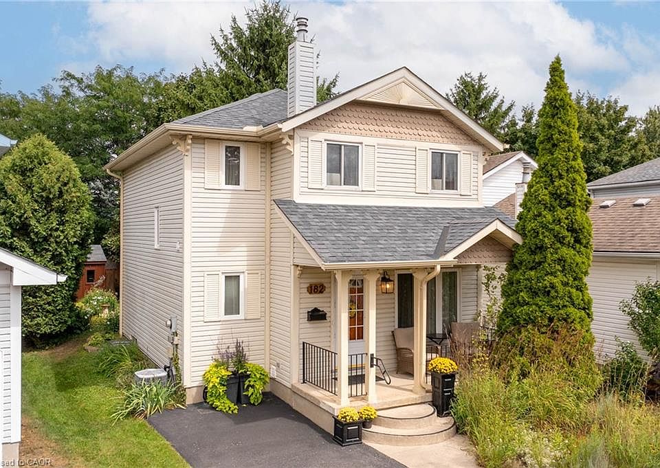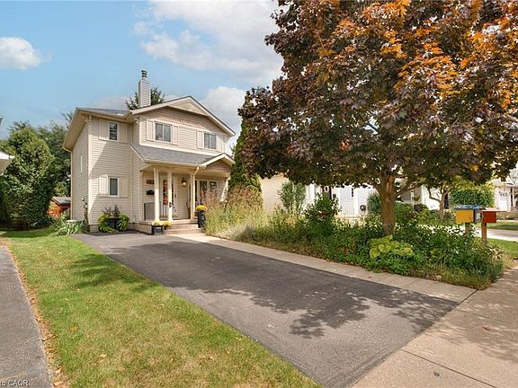 This home has been cherished for years, and it shows in every thoughtful detail, from the front gardens that welcome butterflies, to the two Little Free Libraries inviting neighbours to linger, to the storybook front porch, now reinforced with new steel columns. This is a place that you can set roots in a vibrant urban community while enjoying a cottage-like setting. Inside a stylishly updated powder room is tucked discreetly off the foyer. The living room is spacious and inviting with an oversized front window, easily accommodating a variety of furniture layouts. The dining area adds even more versatility, with space for a home office nook. The kitchen has been beautifully renovated in warm wood tones, featuring a peninsula, loads of cabinets, a striking glass-and-stone backsplash, and sliding doors that open directly to the backyard. Step outside, and you'll find yourself in a private, fairy-tale retreat. A flagstone patio branches into multiple sitting areas, offering the choice of sunny or shaded lounging as you choose your own adventure. Perennial gardens bring colour and charm to every season, while a large garden shed handles the tools, and mature evergreens ensure privacy and colour all year long. Upstairs, you'll find three bedrooms, each with generous windows and closets. It also hosts a fully renovated main bathroom with timeless white finishes and a skylight window, making it bright and cheery. The lower level is clean and functional, featuring a spacious rec room with built-in storage, a bright and tidy laundry room, and a rough-in for a future third bathroom. Come experience a location so accessible you won't need a car, with fantastic schools, great shopping, Rim Park, and situated extremely close to both Bechtel park and Kiwanis park, known for their exceptional walking trails and off-leash dog parks. With Sports complexes, The Grand River, pools, places to worship and the expressway close by, this is where you can write your best chapter.