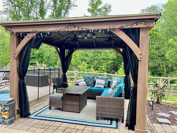 Welcome to this spacious and lovely house w/inground pool, patio and gazebo w/TV. Primary and guest suite on main level. Open floor plan, Upgraded kitchen with quartz counters, breakfast bar, gas cooktop, double wall ovens, pantry and microwave. Open to dining and family room. Dining opens directly to patio and pool areas. Family room features wood shiplap and gas fireplace. Main level laundry. Upper level offers 3 BR's, 2 J&J baths, loft and 2 bonus rooms. 3 car garage, fenced yard backs to woods and additional life saver pool fence. Additional storage shed for pool equipment. Must see this barely lived in house today!