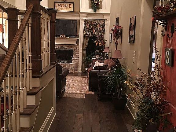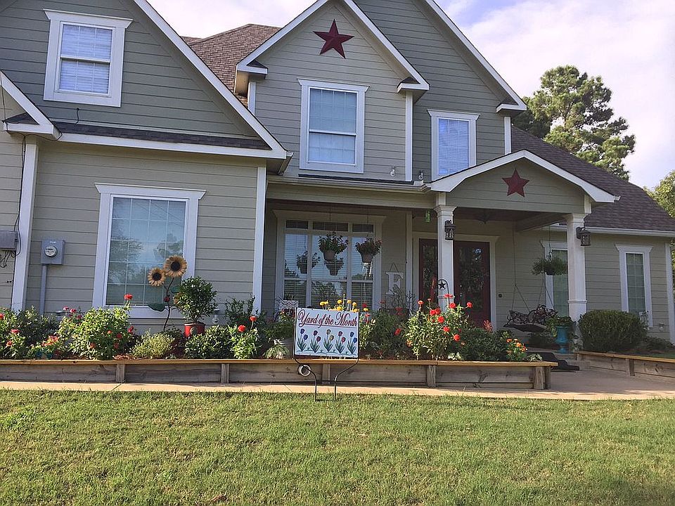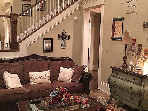 Will pay 3% commission to buyer’s agent. Beautiful custom built home in great location. This home offers an open floor plan with 4 or 5 bedrooms and 3 full baths. The bottom story features the master suite which has a sitting area and recently remodeled master bath. The bath has a custom tiled glass shower as well as a jacuzzi tub and two walk in closets. A double sink area boast granite countertops that match the granite around jacuzzi. The kitchen contains stainless steel industrial size appliances with a double oven, 6 burner gas stove and a double side full size refrigerator and freezer as well as an island with a prep sink, tiled granite countertops and custom cabinets. The hearth/music room features its own gas wood burning fireplace with custom bookshelves. The family room has 20 foot ceilings with canned flood lights and another gas wood burning fireplace as well as two story windows, beautiful hardwood floors with tile insert, a lighted picture insert and beautiful crown molding. The dining room features a built in cabinet that could serve as a china cabinet or credenza if this room was used as an office. Also on the bottom floor is an additional bedroom with it own bathroom/shower that would be perfect for a mother-n-law suite or nursery. Upstairs features 3 bedrooms and a bath. The largest of these bedrooms could be a game room and includes a big walk in closet. The upstairs bath is centrally located and accessible from all three bedrooms. The upstairs landing features a coat closet and is large enough for multiple furniture pieces or decor. All rooms have ceiling fans and there are many small chandeliers throughout house. The house also features custom window treatments. The drive up appeal on this house is gorgeous and features outside landscaping lights attached to house that shine upwards and the glow can be seen from multiple highways in the evening. The flower beds and porches are cozy and confortable and a front porch swing makes it the perfect place to hang out and relax in the evening. The lot size is almost one acre and features a backyard sport court that could be used for basketball, tennis, badminton or volleyball. The outdoor storage building is built on a slab and matches house. This house if a must see.