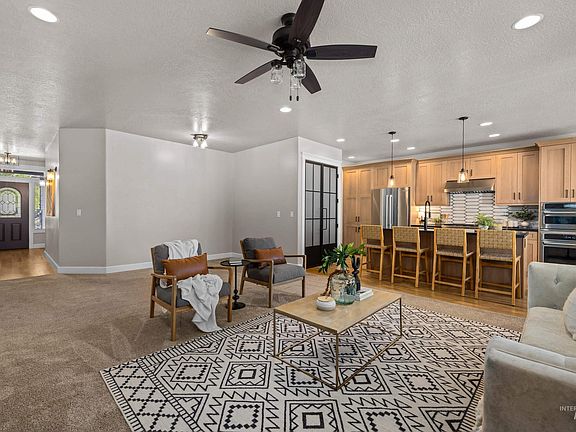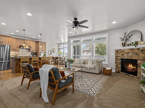 An incredibly updated home in south Meridian, just minutes to the interstate, downtown Meridian & local shops. This home offers a quiet low maintenance community to enjoy snow removal covered by the HOA & optional landscaping. The interior has been updated from top to bottom with finishes like no other. This single-level home features large windows, extensive trim work, & high ceilings. In 2021, the kitchen and primary bath were fully remodeled by a local interior designer. The kitchen boasts high-end wood cabinetry with details such as a pull-out trash can, soft-close drawers, a built-in appliance bar, a six-burner stove, & a hidden pantry behind custom doors, all complemented by concrete countertops & stylish tile accents. The primary suite offers a spa-like sanctuary with a custom sliding barn door. Hardwood flooring flows throughout the main living area, & the oversized two-car garage includes water softener & high-grade epoxy style flooring.