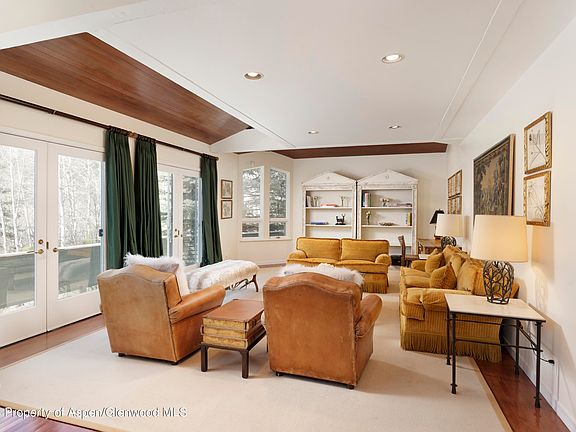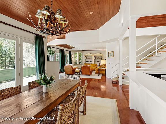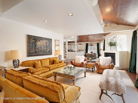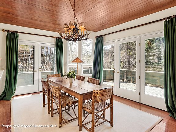 This charming four bedroom home in Aspen's East side is nestled in mature trees with a spacious grassy yard. The open plan living area includes dining for 8 and basks in natural light with multiple sets of glass doors leading to a large deck and mountain views. The upper level is dedicated to the primary suite with an ensuite bathroom and private deck. The three remaining ensuite bedrooms all walk out to the abundant outdoor space. Other features include a separate den offering an ideal spot to watch a movie as well as a 2 car garage. Walking distance to town and on the dial a ride shuttle route, this is a fantastic mountain vacation home.