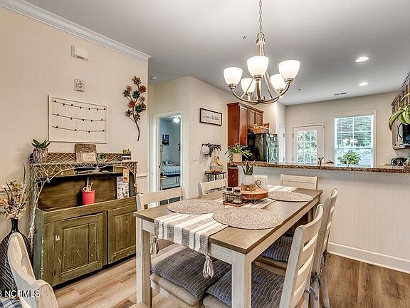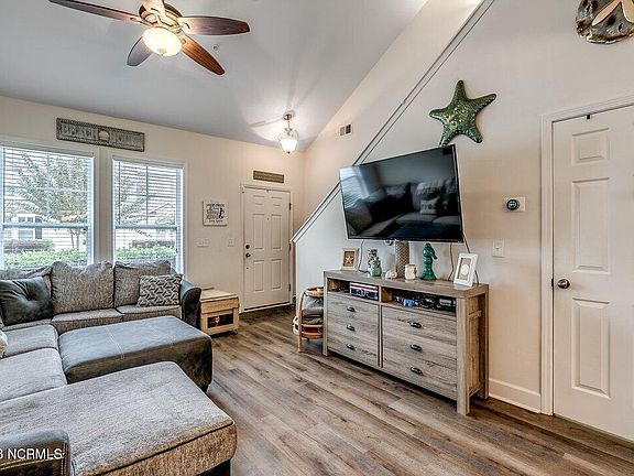 Welcome to the quaint townhome community of Beacon Townes. This home features three bedrooms and three and a half bathrooms, a spacious loft area, two suites, and open common areas. When entering the home, the tall, vaulted ceiling in the living room creates a bright, open, comfortable area overlooking the dining area and kitchen. The LVP throughout the first floor was installed around one year ago. The kitchen includes a pantry and an abundance of cabinet and counter space, perfect for entertaining. The crown molding and wainscoting helps the dining area stand out. The first floor also features a half bathroom and laundry room outfitted with cabinetry and storage under the stairs. Through the laundry room is the oversized, one car garage with tall ceilings and room for storage. The master suite overlooks the backyard with a wooded view and includes a walk-in closet with built in shelving. In the master bathroom, you will find dual sinks and a walk-in shower. The large patio is perfect for grilling and enjoying the outdoors while relaxing with a peaceful, wooded view separated by fencing at long the rear or the property. The upper floor includes a full-bathroom and loft area along with two additional bedrooms. The loft includes a large closet and is perfect for office space, a game room, play area, or additional entertainment space. The bedroom to the left features a walk-in closet while the bedroom to the right boasts an ensuite, full bathroom. Beacon Townes is an active community with events throughout the year such as the community yard sale, July 4th cookout, and Christmas activities to name a few. The community pool is perfect for cooling off or grilling some hot dogs or burgers on the charcoal grill. Sunset Beach, Ocean Isle Beach, Myrtle Beach Wilmington are all nearby, providing plenty of shopping, dining, entertainment, and healthcare options in addition to what Calabash has to offer! Home Warranty paid through Oct 2024 will be transferred to buyer.
