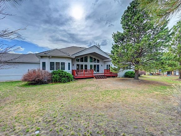 This is the one you have been waiting for! Come home to this true estate property on 5 acres located in the highly esteemed Deerfield community in Douglas County! Beautiful ranch style living with a multigenerational layout including separate garage access to the lower level on an absolutely gorgeous lot with fresh air to breath. Wonderful stucco home with room for everyone to spread out, bring your kids to the great schools, your mom to the 2nd main floor bedroom with en suite, your horse to the rolling acres, your toys and the RV. Open floor plan features a massive living room with gas fireplace, a formal dining room, an office, laundry room and large eat in kitchen leading to a beautiful covered deck that overlooks the magnificent waterfall yard feature. The main floor master suite has a walk-in closet and spa like 5 piece master bath with access to the deck. Another bedroom on the main floor with en suite bath is perfect for guests or dad. Lower level features a theater room, wine cellar, huge family room, 2 bedrooms, full bath, a safe room and large storage or room to finish with access to the garage, 2 furnaces, 2 water heaters 50gal, 80 gal Wellmate, 200 Amp main plus 1 sub electrical panel, humidifier and work bench. Hurry, this one wont last. Cameras are in use at the home.