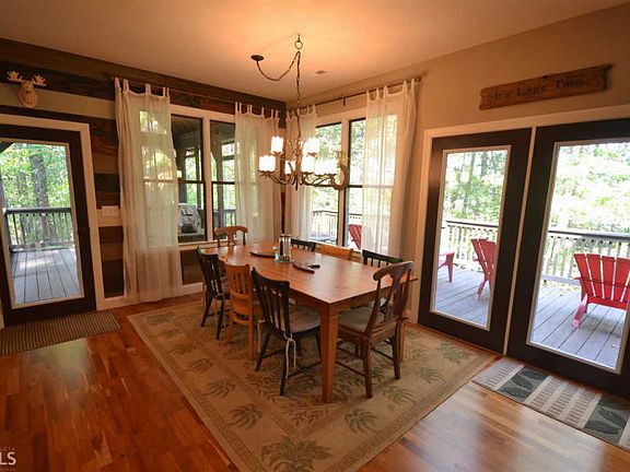 The house is on a very private setting with plenty of parking for friends and family. The front porch welcomes you into the vaulted great room with stone fireplace and wood flooring. The great room is open to the dining area and the kitchen with stainless appliances. The great room opens onto a large open deck and a covered porch with vaulted ceiling. The main level also has three bedrooms and two tiled baths including the master suite. The terrace level has a large rec room with game area, a wet bar, a bedroom, a full bath and a bonus sleeping area. There is an improved walkway to the covered slip dock with boat lift and 2 PWC lifts included in the sale. There is also an attached 2 car garage with an unfinished bonus room above.