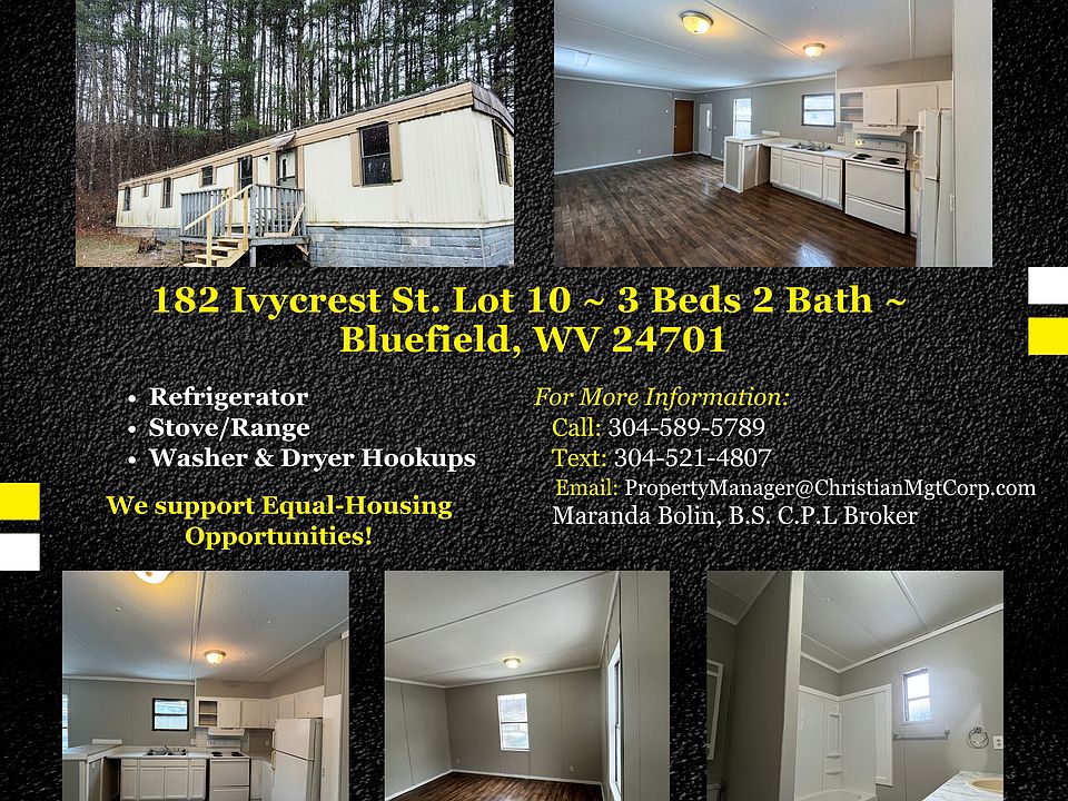 182 Ivycrest St. Lot 10 ~ 3 Beds 2 Bath ~ Bluefield, WV 24701 LEASE OPTION (Path to Home Ownership): Initial payment: $1,500 with no payments due until the 1st of the following month! Monthly payment: $750/month. Includes lawn care. No other utilities included. or RENTAL: Security Deposit: $750. Can be made in payments if needed. Monthly payment: $750/month. Includes lawn care. No other utilities included. Sorry, this home is not HUD approved. This three bedroom two bath mobile home features fresh paint, new flooring, spacious living room and kitchen, washer & dryer hookup with washing machine included, small front porch & yard, lots of natural light with lot rent, water & sewer included in the price! Christian Management Corporation Office Hours: Mon-Fri 9:00AM-5:00PM & 10:00AM-2:00PM the 1st Saturday of every month You can view THIS property 7 days a week! Most pets welcome with a $300.00 pet fee per pet and signed pet agreement. Maximum 2 pets. No aggressive breeds due to insurance restrictions. Clean, safe, quiet, crime & drug-free are our priorities for our residents! We support Equal-Housing Opportunities! Good people with good, bad, low, or no credit but stable employment or Social Security are welcome. -MUST pass background check -NO evictions in the last 7 years -NO sex offenders Is this property not what you are looking for? View our other available #homes, #mobilehomes, #apartments, and more on our Facebook or our website!