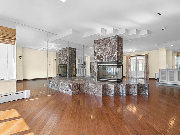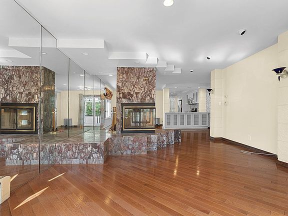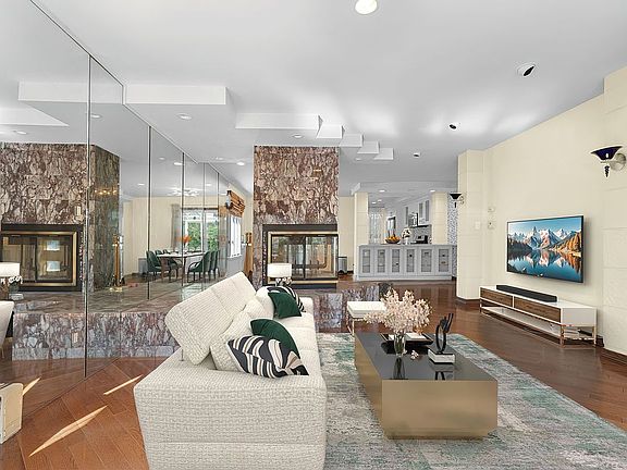 The main floor has an open loft-style layout with gorgeous oak floors and a unique three-dimensional wood-burning fireplace. It starts with a large formal foyer. Large Caesar stone countertops, custom white cabinetry in the European style, a large pantry, and a complete set of stainless steel appliances are all features of the contemporary kitchen. There is a separate dining area next to the kitchen, which leads to a large sunroom with lots of windows and easy access to the backyard.