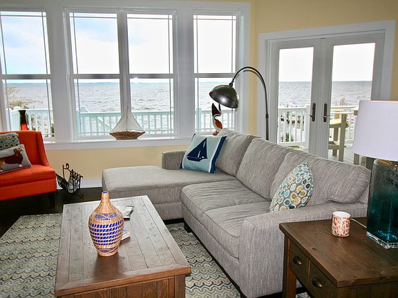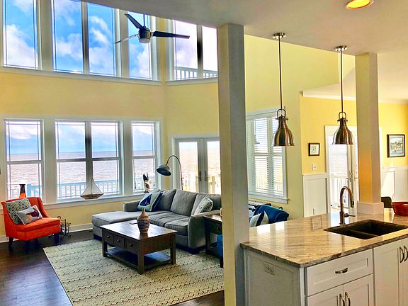 Gorgeous, sound front custom home in sought-after RiversEdge. If you enjoy fishing, boating, jet skiing, kayaking, or other water sports, this is the perfect home for you! This home boasts 18' ceilings, expansive water views & stunning custom finishes throughout. Spacious master bedroom with an ensuite luxury bath & private waterfront balcony. Enjoy stunning sunsets & sunrises from both the east and west facing covered decks. Maintenance free exterior, including Hardi plank siding, Trex decking and vinyl railings. Unfinished areas adjacent to garage offer lots of room for expansion. A MUST SEE