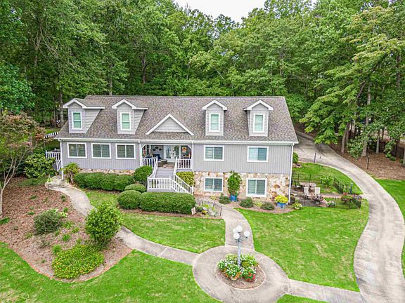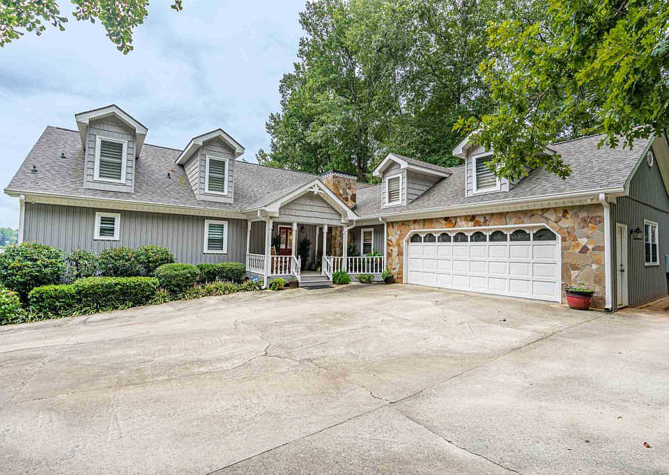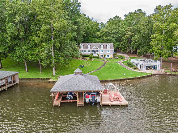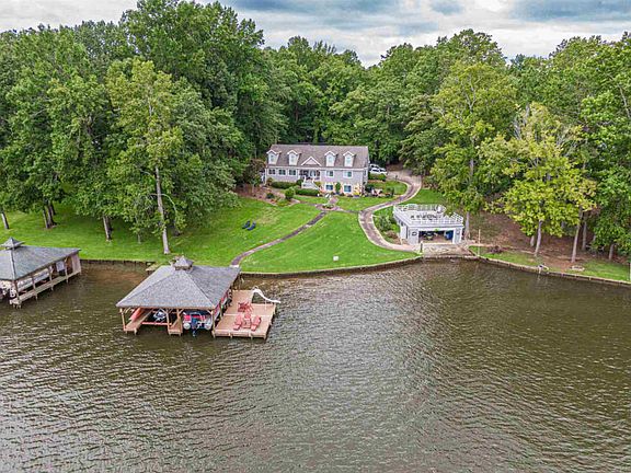 BIG WATER VIEWS! This is the lake home you have been waiting on! This home has everything you could ever want. The recently renovated kitchen has custom easy-close cabinets, granite counter tops, and all new KitchenAid stainless steel appliances. The extra large island has an ice maker, beverage center, and drawer microwave. It also has a rustic pine, tongue and groove ceiling. Home has an open floor plan and a cooking porch for easy access for you to grill outside. The extra large lakeside dining room will accommodate a very large family to see those spectacular views of the lake. Main floor has a huge, lakeview master bedroom with bay window, walk-in closet, and a recently renovated ensuite that has a stained glass window, large soaker tub and separate walk-in shower with granite countertops and marble floors. Main floor also has a guest bedroom and full bath with mudroom and storage. There is also a separate office on the main floor. The upstairs is a kids' haven! It has a huge space for all of their bunk beds and play toys. The downstairs has 2 bedrooms, den/media room, and a full bath. Plantation shutters are throughout the house. It has a sitting porch lakeside on the main level and a walk-out patio from the basement. Max boathouse with 7' water at the end of the dock and another boathouse with a sit-on-top deck for entertainment with a massive storage area for all of your water toys. There are outbuildings also for extra storage for your lawn equipment. This is one awesome walking and/or golf-carting neighborhood. Don't miss this opportunity.