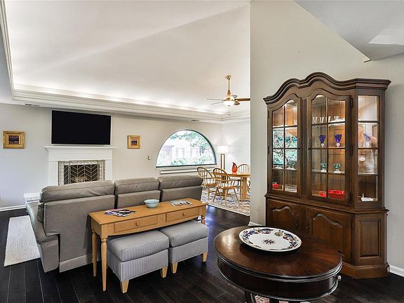 A charming oasis in the heart of Clayton, this 2nd floor unit (no elevator) has delightful soaring ceilings and demi-lune windows. Newer espresso-finished floors create an elegant look, and cove lighting creates just the right mood. Living room has a functional wood-burning fireplace, opening to the dining area and great for entertaining. There's a perfect room with French doors to serve as your office, library or wine room. The white kitchen has newer stainless steel stove, dishwasher and refrigerator, plus pantry and several glass-fronted cabinets to show off special art pieces or dishes. The primary bedroom features a spacious bathroom and walk-in closet; a second bedroom utilizes the updated hall bath. Washer and dryer, in unit, are both staying. The storage is incredible: besides 2 organized hall closets, there is a pull-down ladder to the attic in the laundry room. 2 garage parking spots. Enjoy catching the breeze on the terrace, or head through the lovely courtyard to the pool! Location: Upper Level