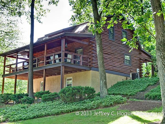 Watch the deer from your back deck! Charming Log Home situated on a quiet 1.5 acres.. Your large front porch welcomes you and overlooks some lovely garden areas and brick/paver walkways. Open floor plan with large living room with wood stove and triple sliding doors opening out to the huge covered deck and the expansive back yard. Great kitchen with custom wood cabinets, stainless appliances and built in microwave and wall ovens, and butcher block breakfast bar with barstools. First floor also offers a dining room area adjoining the kitchen and living room, as well as a powder room and laundry room. The second floor offers a master bedroom with large closet and skylight, Second floor houses two other bedrooms, as well as a full bath. Upper level bath and bedrooms have skylights for lots of natural light. Walkout basement with several closets for storage, a utility sink, and one car garage. Minutes from 422 and the turnpike. Make an appointment to see this great home today.