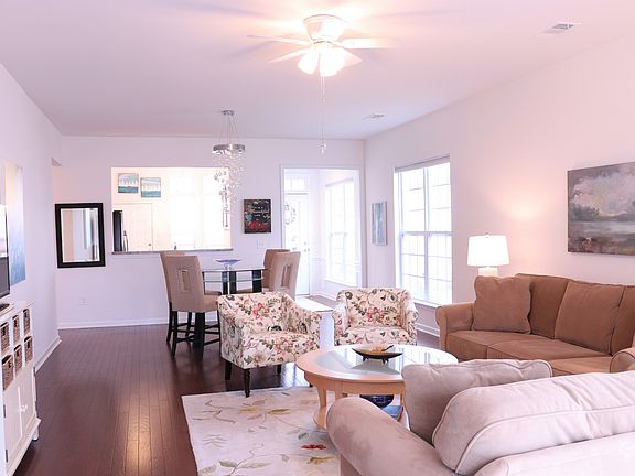 Fantastic turn-key opportunity in gated 55+ resort-style community. Better than well maintained; resident lived in house approx 6 mos/yr. Finished sunroom, hardwoods in kitchen/dining/living rms, upgraded light fixtures, master walk-in closet, stainless appliances. Textured epoxy on concrete patio, front porch, and garage floors. No stairs! Versatile bedrm 3 can be home office or library. Front-loading washer/dryer & garage refrig/freezer also remain. Loads of indoor and outdoor amenities.