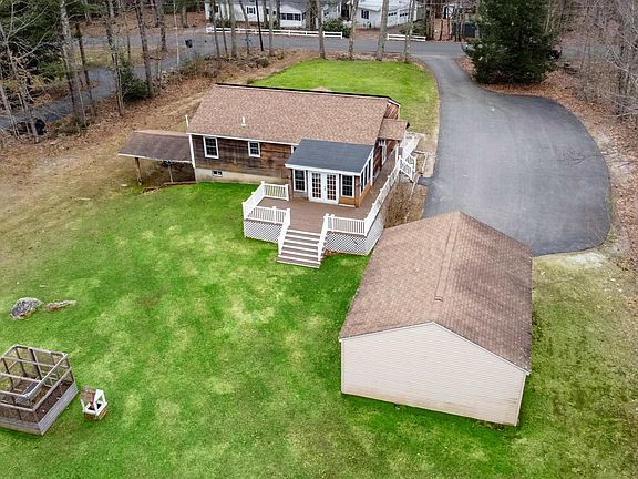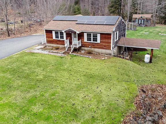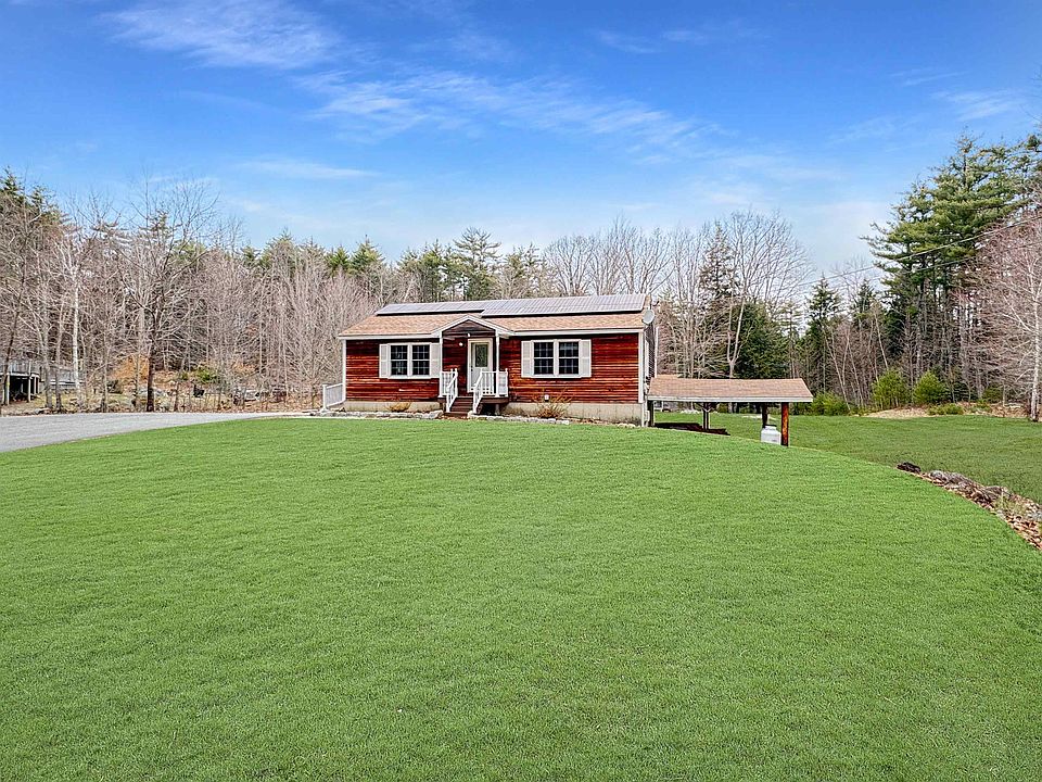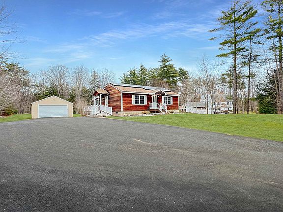 Adorable Ranch home situated on 1.8 acre level lot in Desirable Northwood NH. This home is cute as a button with its wood shake siding and white trim accents that give it that quintessential New England flair. The home has a large level lot with an expansive driveway, two car detached garage, and matching shed. The entry is handicap accessible with a long wood ramp that connects directly to a spacious deck overlooking the rear acreage. The home has been upfitted with it's own solar array making it a highly efficiency choice offering the latest in low carbon green energy. The property come equipped with with a whole home standby generator to keep you warm and toasty when the next Nor'easter strikes. The interior offers an eat-in kitchen with L-shaped breakfast bar, large living area and great natural lighting. There is beautiful covered porch sporting solid wood flooring, panoramic windows and French doors that lead directly to the rear deck. There are two bedrooms on the main level with access to a full bath just across the hall. Downstairs there is a bonus room, additional half bath and a convenient laundry area. The lower level also offers interior storage and has a walkout exit. All this with access to sought after Coe Brown Academy.