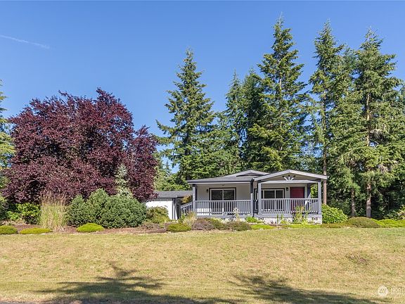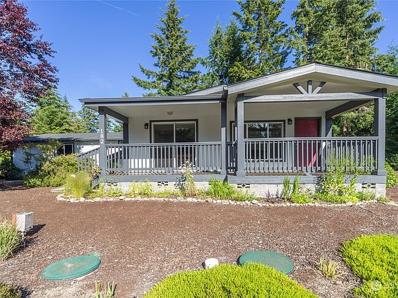 This lovingly cared for, and attractive one-level home will capture your heart! It offers an open floor plan with vaulted ceiling, a large kitchen with newer stainless-steel appliances, a walk-in pantry, and a large eating bar. The spacious dining room and living room are open to the kitchen. The primary suite is generous in size with a luxurious bath complete with soaking tub and shower. A large covered front porch/deck greets your guests with easy-care Trex decking. The many upgrades including window coverings, gutters, and water heater. The patio fencing will be painted as soon as weather permits, prior to close. Lot rent includes septic. This manufactured home community is quiet, well-maintained and near most Port Hadlock amenities.