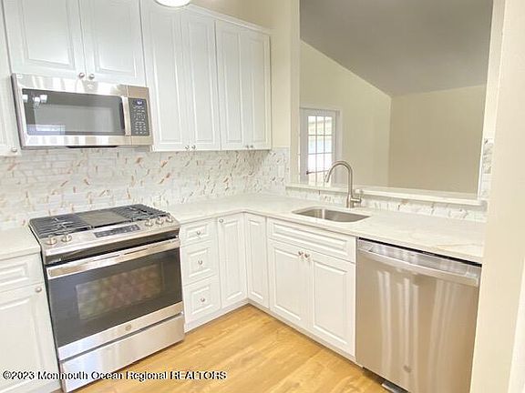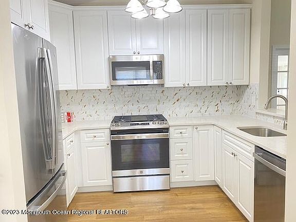 This totally renovated expanded EDGEWATER MODEL home boasts new kitchen with quartz counters and tile backspllash and new, stainless GE appliances. The entire house has new easy care laminate flooring and tile in the two new bathrooms. New high efficiency heat, AC and hot water heater. The property backs to woods with seasonal views of water. There are French doors leading from the living room to a large 4 season room that backs to the rear of the property. The exterior is maintenance free with new vinyl siding and aluminum trim. There is a new concrete double wide driveway and the garage has a new door and has been completely painted both floors and walls. The sprinkler system is maintained by the assoc, along with cutting the grass. Seller will allow $1,360.. for a year flood ins.