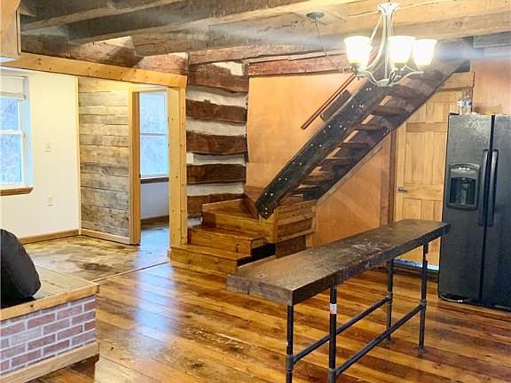 The most unique log home you'll ever see! Welcome home to 182 Taffy Run Road in New Sewickley! Some say this home was around during the carriage/horse time and was a former post office! This log home has so much to offer: 3 bedrooms, could easily be 4, 1.5 baths, barn-wood flooring, a main floor bedroom, a distinctive kitchen island, nice cabinets, all appliances included, a bedroom loft (carpet coming!), an office, really interesting walls, lots of great details, a spacious 2 car attached oversize (11ft) garage, all on 2.59 pretty acres and definitely private! The second floor has two bedrooms, 1 with a partial bath. The basement is accessed outside and houses the mechanicals. The first floor bathroom (floor is heated!) includes the laundry. Great porch, nice and big back deck, great yard with lots of space and a firepit area. Asphalt roof 2015, water heater, AC, furnace 2016, septic serviced 2019, 200 amp. A very interesting home!