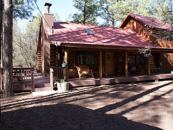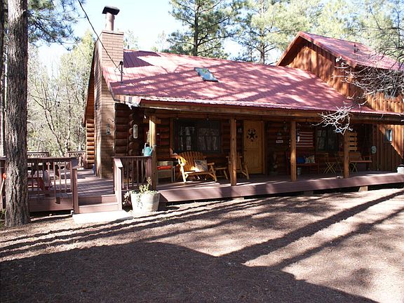 HERE IT IS!!!! The ultimate cabin in the woods. This log home beauty sits on 4.57 acres of gorgeous heavily wooded forest right along the Rim. Undisturbed Reservation land is directly across the road with views that will take your breath away and all you can hear is the breeze in the pines. The deep front porch that extends along the entire front of the house and the wraps around to the side allows for that glorious indoor outdoor living we crave in the summer time. Inside you will find the master bedroom downstairs with an extra room and two baths. Enjoy a relaxing soak in the claw foot bathtub or in the comfy reading nook upstairs in the loft. The bedroom upstairs does not have a closet but has room for a large armoire OR you could easily use it as a craft area or den. Call today!