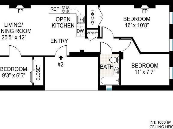 - Total interior livable area: 1,000 sqft