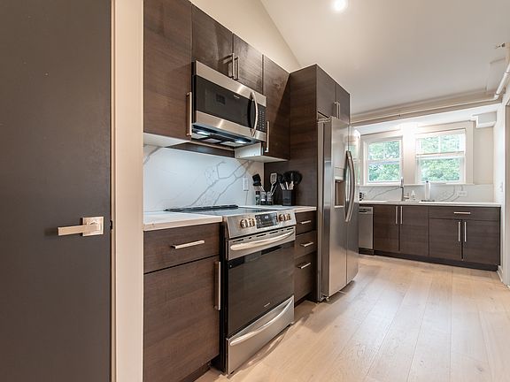- Sleek stainless and quartz kitchen