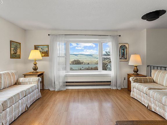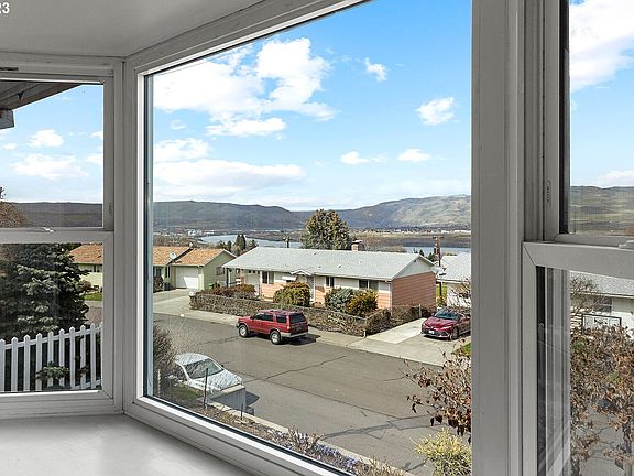 Desirable 3 bedroom 2 bath home on the east side of The Dalles! Beautiful river and city views. Upstairs living room features bay window adding great natural light and highlighting amazing views! Big kitchen open to dining. Kitchen features ample counter space, storage, corian counters, and kitchen appliances. 2 bedrooms upstairs and 1 full bathroom. Downstairs features cozy family room with french doors. Storage room or small office space and large laundry room with storage shelving. 3rd bedroom and bathroom downstairs. Carport with storage shed. Low maintenance front yard. Side yard has space for small garden. Covered patio with storage shed. Enjoy the river view from the deck! Great neighborhood!
