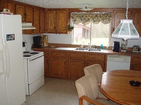 Originally a mobile home that has been added on to and bricked and roofed. Master bedroom with 6 x 11.5 walk in closet, eat in kitchen with oak cabinets opens to great room. Older 35 x 42 open storage shet attached to 20 x 20 enclosed shed/shop, needs some work. Peach & apple trees, and storm shelter. 32 x 8 covered concrete back deck and 15 x8 covered storage area. oak front door with glass cut out.