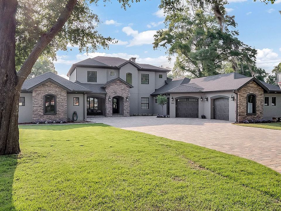 Experience the most newly built custom lakefront home available in Western Seminole County situated on over 1.5 *sub-dividable* acres of cleared land accented by soaring oaks and an impressive brick paver drive leading you to this remarkable home. 1820 Lake Markham Rd features impeccable design and style perfectly assembled for an enlightened lifestyle on serene Lake Markham, one of Seminole County's most exclusive private ski lakes boasting over 77 acres of fun on the water. Enjoy timeless elegance coalesced with the newest energy efficient materials and a truly open floor plan thanks to its nearly 4,200 sf of living space. Secluded down a long brick paver drive and nestled on the lakeshore, this newer build features an open layout with an impressive two-story great room and a wall of windows beckoning views of the lake. The designer kitchen is a chef's delight thanks to stainless GE Monogram appliances including gas cooking and spacious design. Quartzite countertops top off this incredible space, the walk-in pantry and the butler's bar beyond. The master bedroom enjoys vaulted ceilings and its own outdoor seating area. The master bath is a place for relaxation thanks to a garden bath and walk-in shower. The office is just steps away from the master as is the powder bath. A strategically placed game room with adjoining craft space and en-suite bath can easily be used as a 2nd first-floor bedroom. The laundry is oversized and includes an amazing dog washing station fit for multiple uses and this space enjoys a convenient hidden pass through to the master bath. Upstairs are bedrooms three and four, both equally spacious, featuring en-suite baths. Bedroom 5 is currently set up as a second-floor entertaining room, also with en-suite bath access. Incredibly versatile, a third-floor space resides up a stylish spiral staircase, currently used as a TV room/loft. A conveniently located second laundry completes the 2nd floor. Take the excitement outside for a dip in the saltwater pool and spa. Lots of brick paver deck spaces are ideal for entertaining. The summer kitchen is complete with a built-in grill, reclaimed wood exhaust hood, wet bar and fridge. Pull up a chair in the outdoor eating space or relax in front of the TV and fireplace while watching friends and family splash in the pool and lake. Having friends and family over but having too much fun out back to watch the door? No worries, the side entry is perfect for allowing guests to enter the fun zone without walking through the house. Three oversized garages, including one with front/rear retractable doors, complete this amazing property. The new owners of this fantastic home will enjoy several improvements not evident at first glance, such as stubs for front entry gates and dock, reinforced footers at the pool for a screen enclosure, and many more. In addition to the amazing lifestyle this home brings, a wealth of outdoor activities is available nearby, including golf and country clubs, walking and hiking trails, and easy access to attractions and the beaches. Seminole County enjoys top-rated schools, and boutique dining and shopping are just moments away as are the major thoroughfares of I-4 and the 429/417 beltways. The options are limitless with lakefront living, it's a lifestyle of memories to cherish for a lifetime.