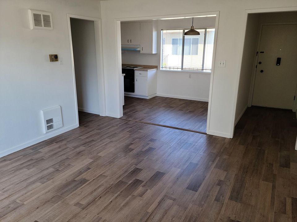 Clean, Sunny, Quiet and central Alameda. Beautiful luxury vinyl flooring and top floor. Lots of light, closets and kitchen cabinets. 3" baseboards, shower over tub, eat in kitchen, miniblinds, electric heat and garbage disposal. Coin washer and dyer in building, seismic upgraded and built in 1960. Shown by appointment only. Best to leave phone message slow. Owner pays water and garbage. $1,845 security deposit. No smoking, no pets, no loud music, one year lease and above 725 credit required. Close to buses to san Francisco, downtown Oakland, BART, Park St and Webster St. No pets, no loud music, no smoking and above 725 credit score for all adults required.