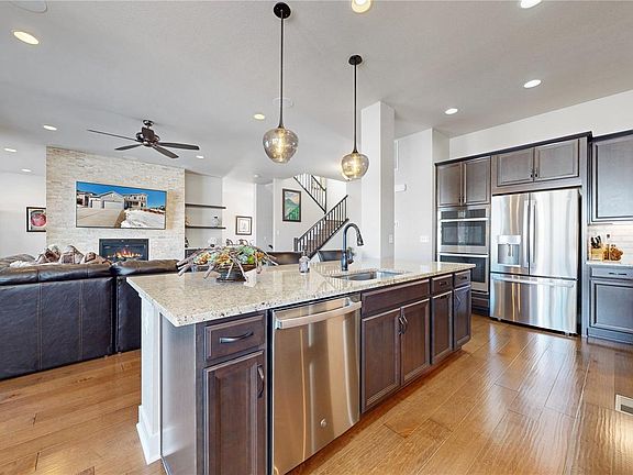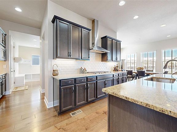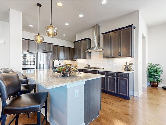 Welcome to luxury living in the coveted Candelas neighborhood. This exquisite David Weekley home boasts elegance and functionality at every turn. As you step inside, you're greeted by soaring 10-foot ceilings, a warm, modern, and cozy family room with a stone-wall fireplace, gleaming rich hardwood floors, an abundance of natural light, and Rocky Flats Wildlife Reserve as your backdrop, creating a spacious and inviting atmosphere. The versatile den or office is the perfect fit for those working from home or just seeking a private retreat.