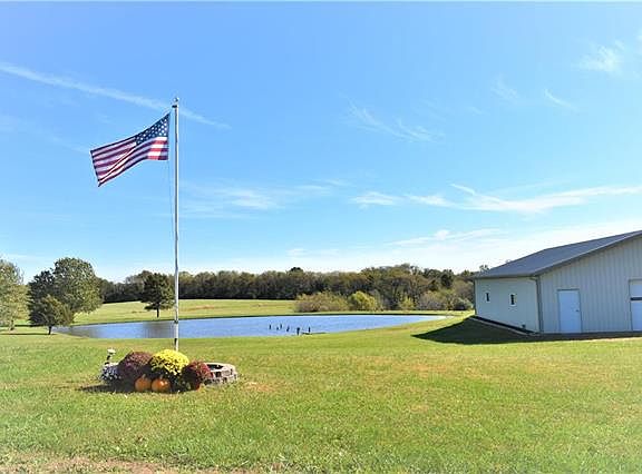 Immaculate ranch with beautiful view of stocked pond and 10.25 acres and 36x50 Cleary out building. Property backs up to Corp of Engineer land. Open concept with hardwood floors, see through fireplace, and kitchen island for entertainment. 3 bedrooms with option of 4th bedroom all on main floor. Luxury master suite with Jacuzzi tub, walk in shower, dbl vanity, walk in closet and door to deck. Partial finished basement w/ dry bar and walk out. Unfinished storage w/ concrete safe room on lower level.