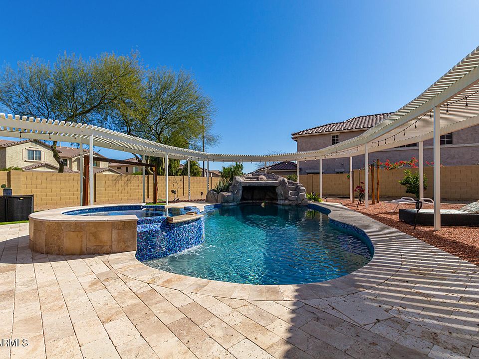 *Seller will pay for 2 years of solar loan payments as a concession at close!* Why buy a new build when you can have an upgraded home with a spa like backyard! This home shows pride of ownership at it's finest. Come relax under the covered patio and in the huge custom diving pool and spa with pebble tec and beautiful decorative tile, a grotto with a fountain, travertine pool decking and pergola that elegantly surrounds the pool area. Inside the home is a bright open floorplan-perfect for entertaining! Upgraded downstairs flooring, upgraded cabinets, granite countertops, and stainless steel appliances in kitchen! There are two pantries and a storage closet downstairs! Seller is willing to sell furnished with separate bill of sale. Upstairs is a huge loft, large master bedroom, a walk-in closet, and double sinks, separate tub and shower in master bath. Two spacious secondary bedrooms and upstairs laundry with cabinets and a sink!