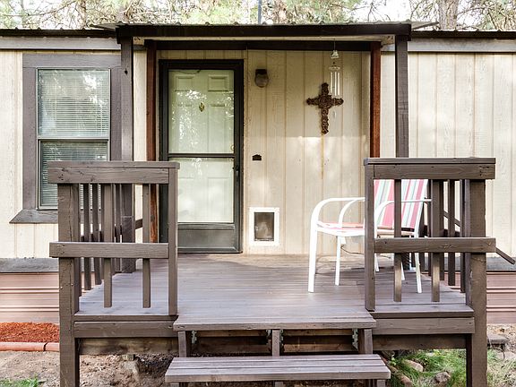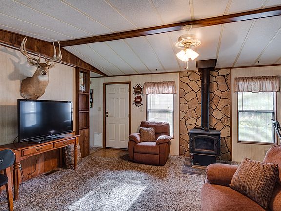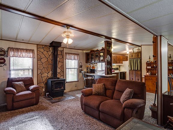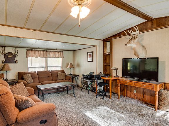 Fabulous setting on over 8 acres and treed. This 2 bedroom manufactured home has a open floor plan with additional 8' tip out in livingroom, giving it more of the great room concept. Sprinklers, small out building and you can watch the wildlife from the patio.