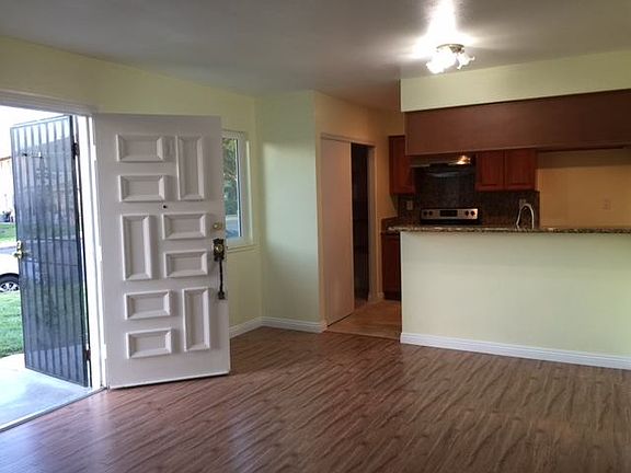 Front one level unit condo at a cul-de-sac with 2 bedrooms and 1 bathroom on ground level with upgraded renovation of fresh painted,new dual windows, granite counter, new appliances, new air condition. Ceramic tile floor in kitchen and Laminated floor in living room, dining, Carpet in bedrooms,etc . Close to freeways, restaurants, markets, schools, banks, and parks. Owner pay for trash, fico min 600