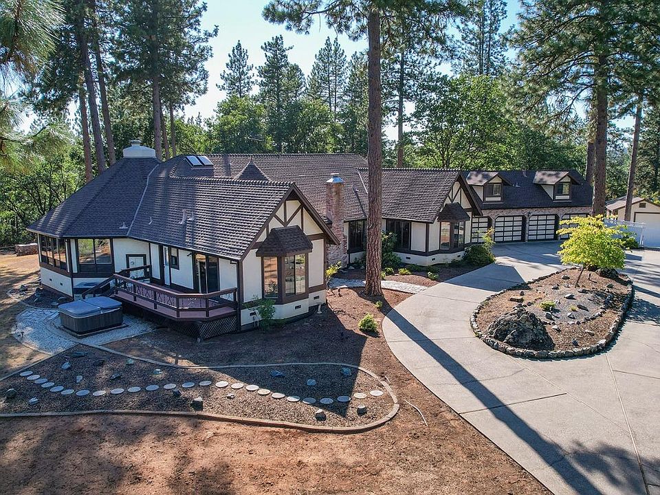 Serene hilltop Tudor estate in Alta Sierra with expansive views of the Sierras sitting on 5 acres of prime Sierra Foothills real estate. This single-owner custom-built family estate has been lovingly cared for and immaculately maintained including an estimated 3 acres of cleared land around the home for fire safety. The unique home design lends itself to entertaining with each of the 3 bedrooms being its own en suite and having 2 large family rooms with vaulted ceilings. Stain-grade wood, stained glass, and natural stonework inside and out add to the warmth of the home. Many elegant Christmas parties and family gatherings have been had at this home. A 600-plus square foot apartment with 1 bedroom, 1 bath, and a full kitchen makes for a perfect in-law quarters or attached apartment (with a separate entrance) perfect for rental income. A 4-plus car garage and two large fully finished sheds mean that storage is not an issue. Updates include new HVAC for the main residence in the last 8 years, a roof with 10 years of life left, and all maintenance has been kept current. This estate is ready for someone to turn into their own home to make many happy memories.