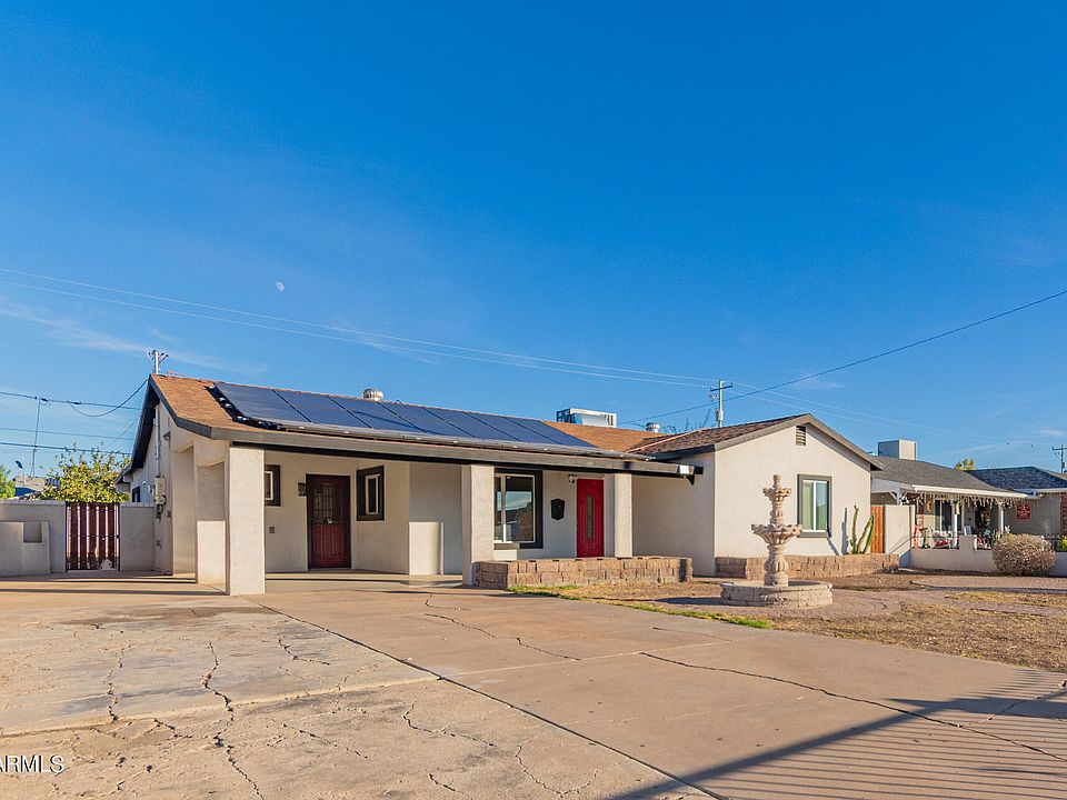 Yes, the house has fully paid solar panels. Thoughtfully updated throughout, this home provides a perfect blend of style and comfort. It features 4 bedrooms, including 2 master bedrooms. The kitchen is adorned with white cabinets, quartz countertops, and stainless-steel appliances. The modern marble bathrooms showcase amazing showers. The front yard is welcoming, complete with a water fountain. Additionally, it's conveniently located steps away from amazing dining and shopping opportunities.