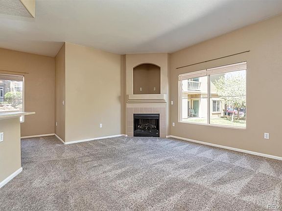 Don't miss this spacious two-bedroom, one bath condo located on the ground floor! This end unit is bright and light with extra windows and boasts an open floor plan with dine-in kitchen, including a peninsula for additional bar seating. There is carpet through out and laminate floors in the kitchen and bathroom. The large living room has a gas fireplace for those chilly nights. The primary bedroom has a sliding glass door leading to the private patio and is connected to the bathroom with dual sinks. The second bedroom is good sized, as well. Both bedrooms have large closets. Located right next to the clubhouse and pool, this condo has designated parking and is near Buckley Space Force Base and Side Creek Park with convenient access to E-470, I-70 and is only a short drive to DIA!