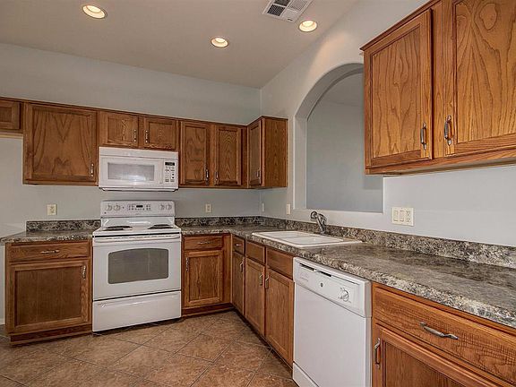 Fantastic and move in ready. This home boasts update lighting, ceiling fans and tile and carpet in all the right places. The kitchen sports white appliances, granite countertops, recessed lighting and lots of cabinets. The roomy master bedroom comes with a private en suite with double sinks, walk in closet and a separate bedroom exit. The backyard has a covered patio and spacious enough for your future desert oasis.