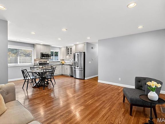 This charming, move-in ready 3-bedroom, 2-bath home checks every box! From the moment you step inside, you'll love the warm, inviting living room with gleaming hardwood floors that flow throughout the main level. The remodeled eat-in kitchen shines with stainless steel appliances, modern finishes, and generous space for casual dining or gatherings. Three main-level bedrooms and a full bath round out the upstairs with comfort and functionality. Downstairs, the finished lower level offers a spacious rec room—perfect for movie nights, playtime, or a cozy home office—along with an additional full bath for extra convenience. Recent updates like new windows and a hot water heater add peace of mind, while the backyard invites you to relax or entertain in a private outdoor setting backing to a wooded common ground and creek. Located in the sought-after Rockwood School District with quick access to Highway 141, within a subdivision that offers a neighborhood park and walking distance to the high school. This gem combines comfort, location, and lifestyle in one perfect package!